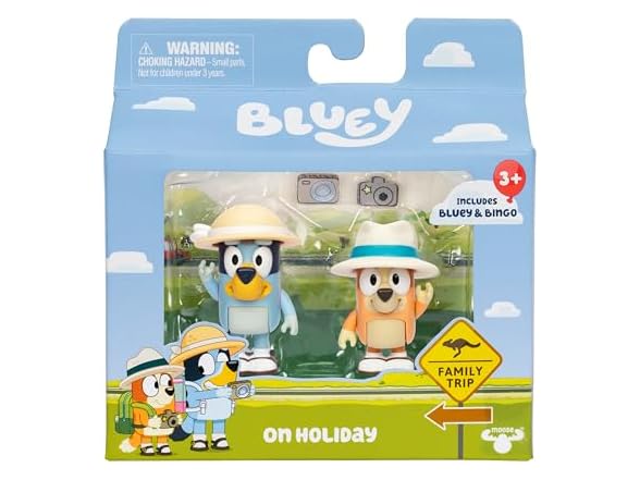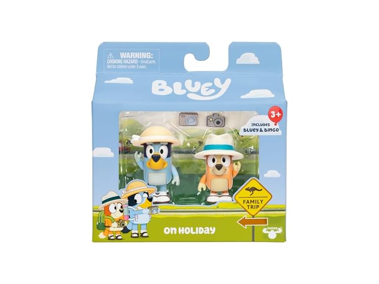 - Bluey Holiday Pack: Bring home the fun of Bluey to recreate memorable moments from the show with our toddler figurine toys inspired by the episode “Born Yesterday”; this Bluey playset includes two Bluey adventure holiday figures ready for playtime