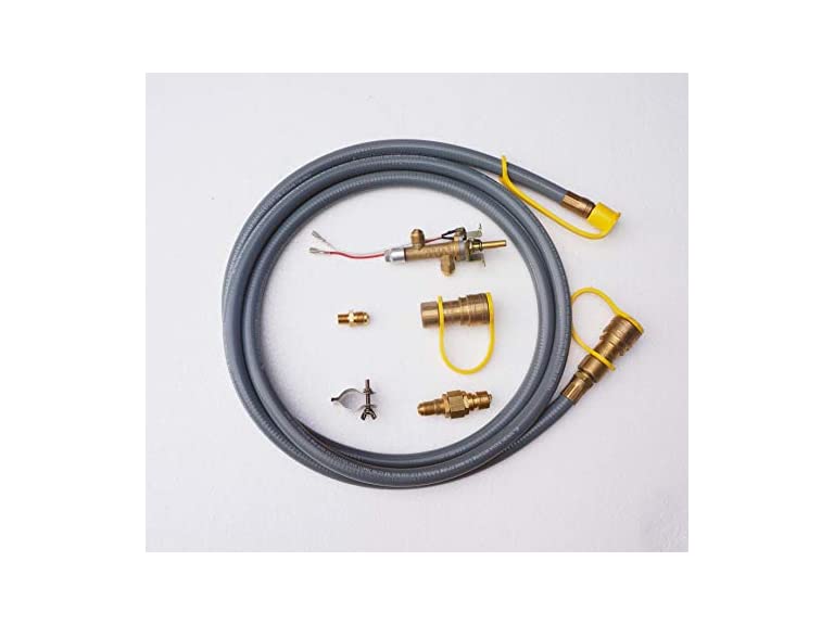 - Contents include: a 10 ft natural gas hose, 2 sets of quick disconnect devices, one connector, one gas valve with microswitch, 1 clamp (burner air adjustment), 1 orifice (injector)