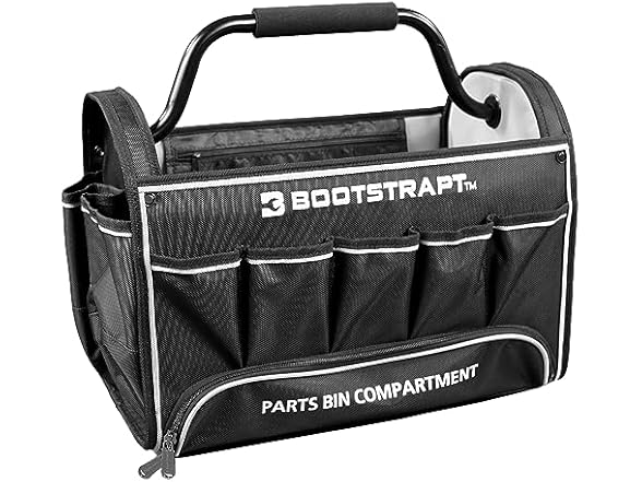 - Base of the tool tote has an integrated parts bin inside a zippered compartment