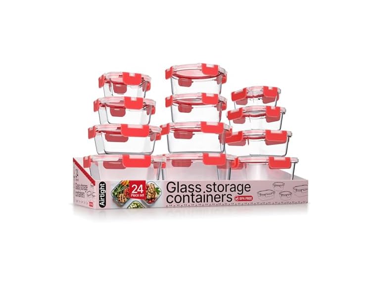 - Bakken Borosilicate Glass Food Storage Containers with Lids 24 Pieces, BPA-Free Stackable Lunch & Leftover Containers, Microwave, Freezer & Dishwasher Safe, 100% Airtight Leak-Proof, Red