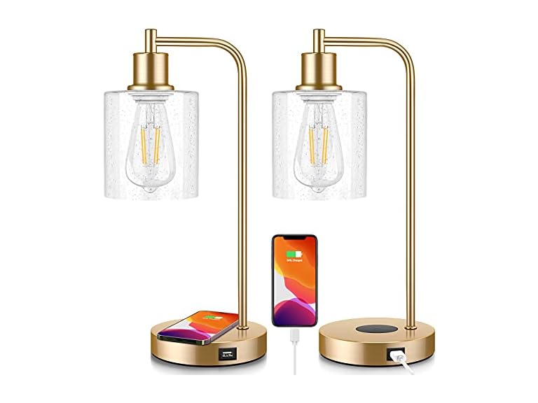 - (1) Bosceos Set of 2 Wireless Charging Industrial Table Lamps 3-Way Touch Control Dimmable Desk Lamp with USB Ports Bedside Lamp with Hanging Seeded Glass Shade for Office Bedroom Living Room, Bulbs Included - Choose Color