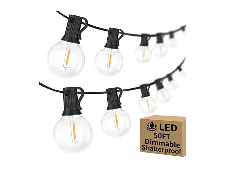 - 【Waterproof & Shatterproof, Safe For Use】With fully sealed and waterproof design socket, The outdoor string lights can stay under the sun, rain, even in the worst weather conditions. Unlike other string lights that made by glass which easy to crack and heavy, the bulbs of our 50ft G40 outdoor backyard lights are made by plastic. It won’t be easily broken while dropping down or blow away by the wind, much safer for using, keep you away from dangerous shards