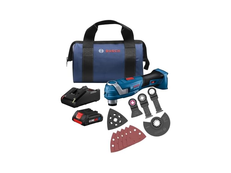 In the box: (1) BOSCH GOP18V-34B14 18V Brushless StarlockPlus® Oscillating Multi-Tool Kit with (1) CORE18V® 4 Ah Advanced Power Battery