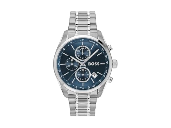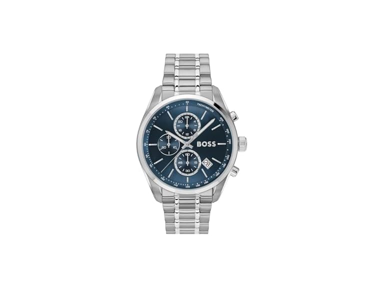 - BOSS Men's Grand Prix 44 with a stainless steel case, blue dial, and a silver bracelet.