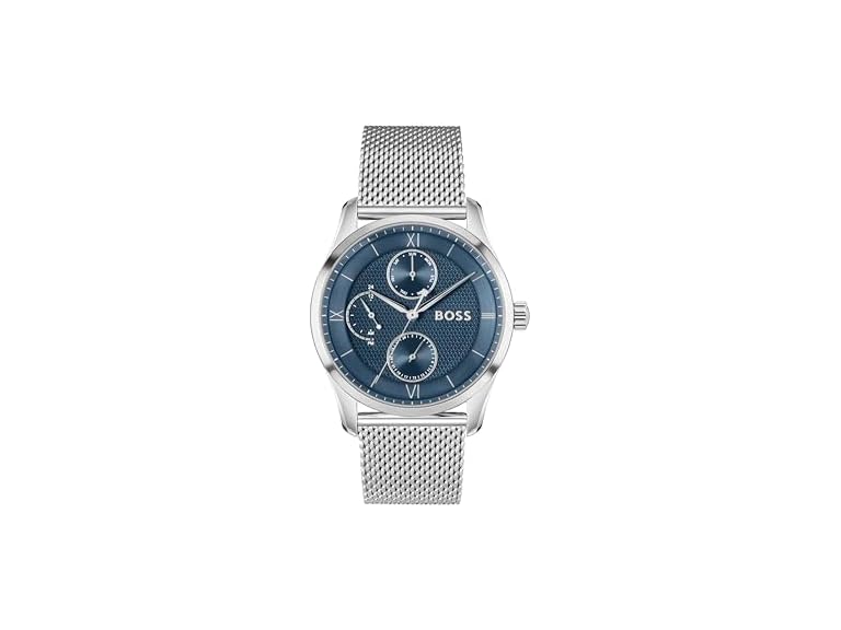 - BOSS Men's Principle Master, Stainless Steel Case, Blue Dial, with Silver Mesh Bracelet