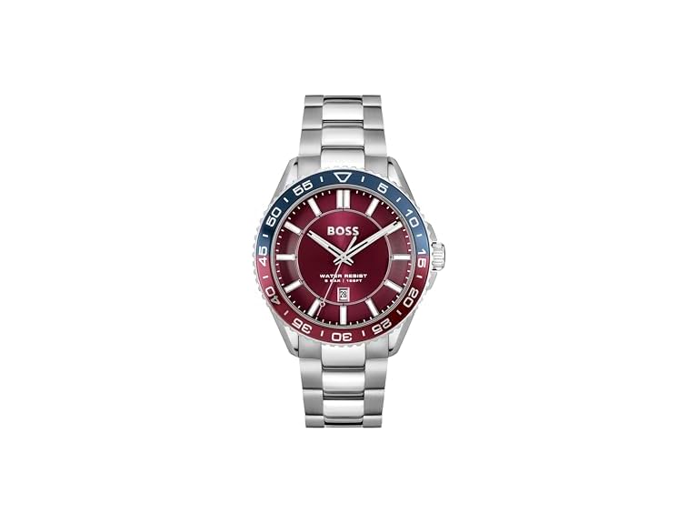 - The Runner 3H from BOSS Watches showcases vibrant colors with its sunray dial and CD-cut outer ring. A two-tone bezel, stainless-steel bracelet, and luminescent details enhance its sporty design.
