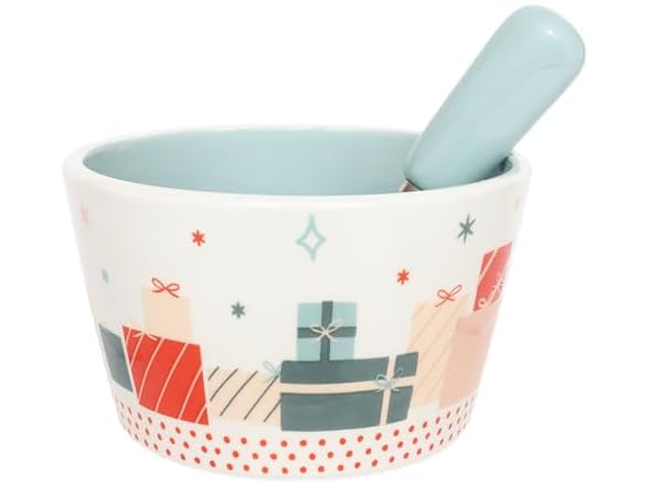 - DANCING DEER Bowl features pattern of wrapped gifts, spreader handle is coordinating light blue