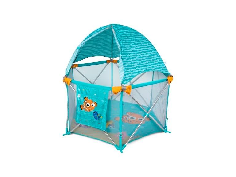 - (1) Bright Starts Disney Baby Finding Nemo Pop 'N Play Deluxe Portable Playard, Pop-and-Fold, Baby Beach Tent, UVA/UVB Protection, Indoor/Outdoor, 6 Months+