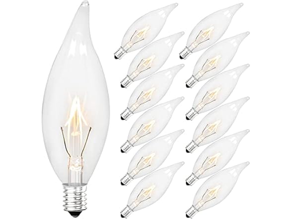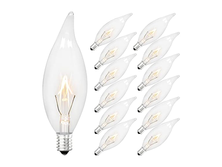 In the Box: (1) Brightever 12-Pack Vintage Incandescent Light Bulbs 40W, Dimmable 2500K Warm White Clear Flame Tip Candelabra Light Bulbs, 380Lm E12 Small Screw Edison Candle Bulbs for Chandeliers, Ceiling Fan Lights