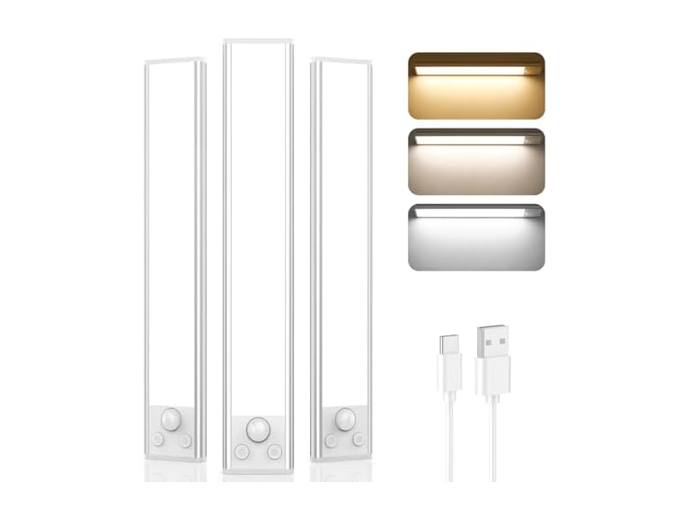 In the Box: (1) Brightever Under Cabinet Lights, 14-Inch Rechargeable Battery Operated Motion Sensor Lights Indoor, 3200mAh Wireless Magnetic Dimmable Under Closet Counter Night Lights for Kitchen Stair, 3 Packs
