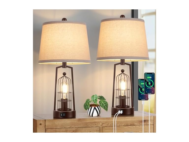 - (1) Brightever Farmhouse Table Lamps with 2 USB Ports, Set of 2 Rustic Industrial Desk Lamp for Living Room, 2-Light with Beige Lampshade for Bedside, Bedroom, Nightstand, House Decor, Reading - Choose Color