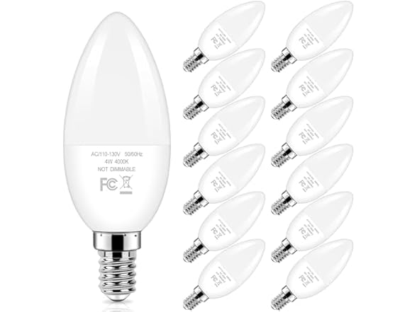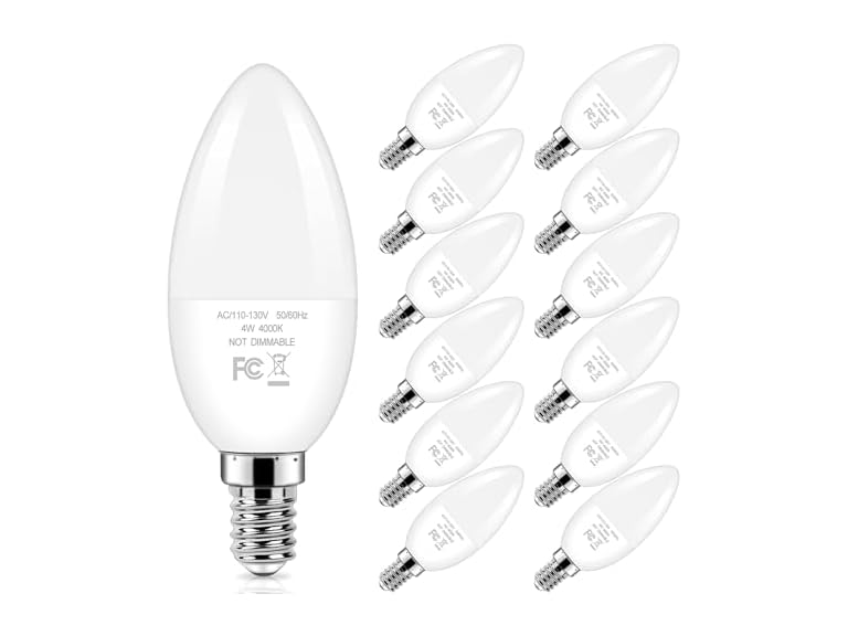 In the Box: (1) Brightever E12 Candelabra LED Light Bulbs 40W Equivalent, 4W Small Candle Light Bulbs Neutral Light 4000K, Type B Ceiling Fan Lightbulbs for Chandelier, Table Lamps, Non-Dimmable, Pack of 12