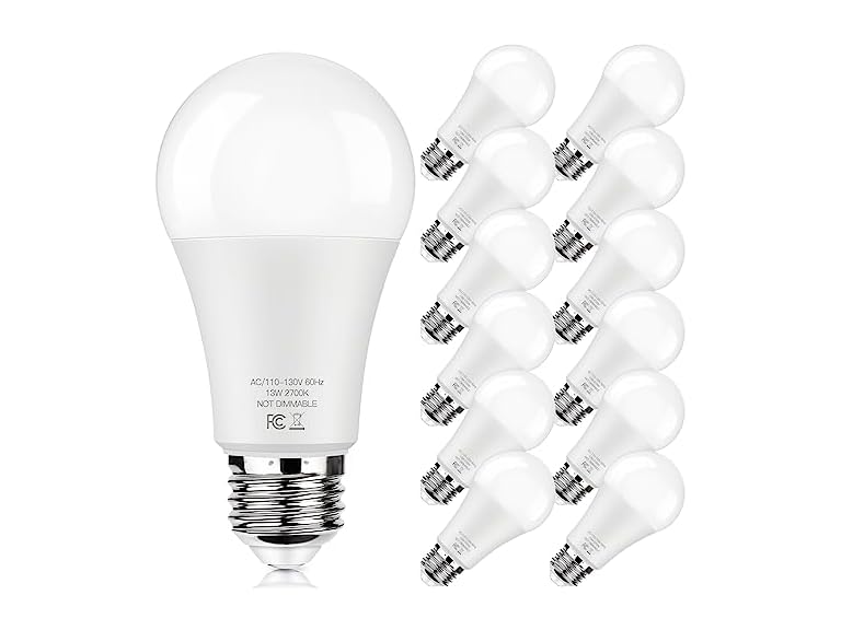 In the Box: (1) Brightever LED Light Bulbs 100W Equivalent 1500 Lumens, A19 13W 2700K Warm White Non-Dimmable, Super Bright No Flicker Standard E26 Edison Screw Bulbs for Home, Bedroom, Office Lamp, 12-Pack