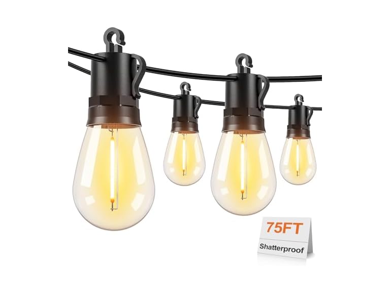 - 【Unrivaled Durability & Energy Efficiency】Crafted with upgraded heavy-duty wires and reinforced PVC coating, our 75FT outdoor string lights are designed to withstand long-term wear and tear from both indoor and outdoor use. Utilizing innovative energy-saving filament tech and undergoing rigorous durability testing, these LED bulbs offer a lifespan of up to 30,000 hours while consuming 90% less energy than incandescent bulbs. Ideal for holiday decorations or daily lighting in any space.