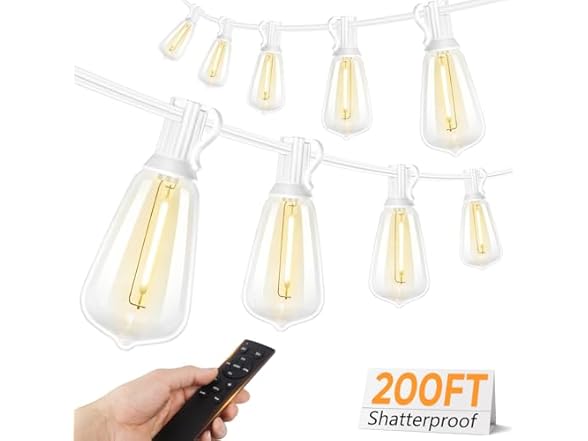 - 【Unrivaled Durability & Energy Efficiency】Crafted with upgraded heavy-duty wires and reinforced PVC coating, our 200FT string lights with remote are designed to withstand long-term wear and tear from both indoor and outdoor use. Utilizing innovative energy-saving filament tech and undergoing rigorous durability testing, these LED bulbs offer a lifespan of up to 30,000 hours while consuming 90% less energy than incandescent bulbs. Ideal for holiday decorations or daily lighting in any space.