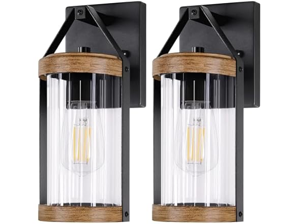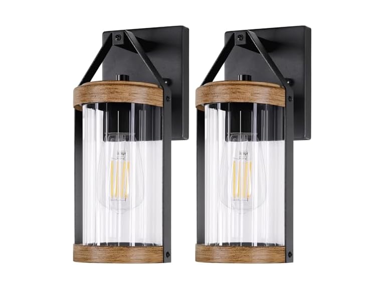- Classic & Elegant Design: Our outdoor wall lights feature a charming structure with a black and wood matte line frame that not only adds a touch of elegance but also serves to support and protect the inner shade. The cylindrical shade is made of clear threaded glass, which creates a mesmerizing light effect when turn on, transforming your patio into an enchanting sanctuary