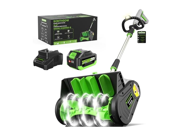 - 【Gear up for hassle-free snow removal with SONTHIOW’s complete accessory bundle】: 13.5 inch Cordless Snow Shovel | 1Pack 4.0Ah high-capacity batteries keep you clearing longer | Rapid charger gets you back in action fast | Adjustable front handle customizes to your comfort | Directional snow deflector lets you aim snow exactly where you want it,No need to buy extras—we’ve got all the essentials for efficient, stress-free winter cleanups.