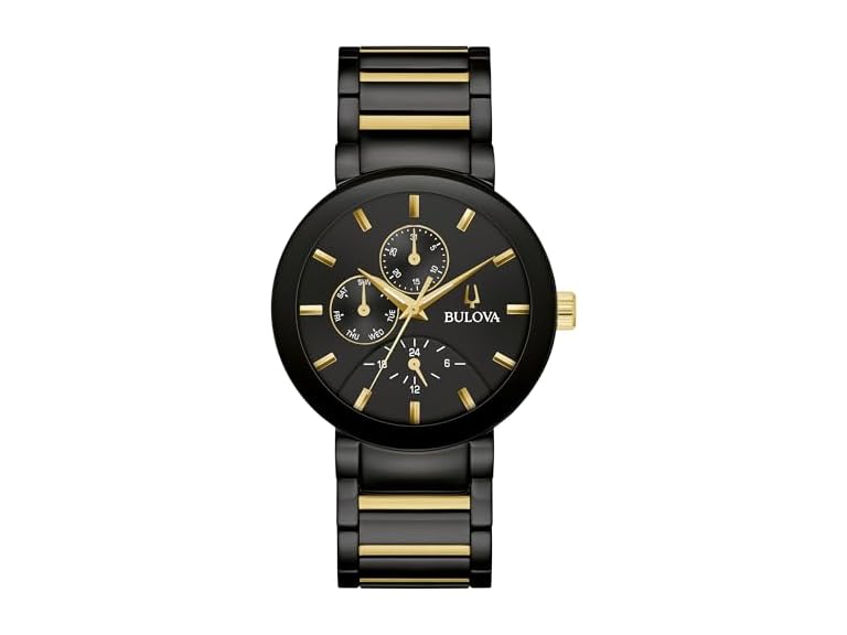 The Bulova men’s Modern collection breaks the mold by pushing the boundaries of modern watch design. The sleek black IP and gold-tone stainless steel case features an edge-to-edge domed mineral crystal with black metallization for an exceptionally modern look. The mesmerizing black dial features a combination of gold-tone markers and hands with a 24-hour display and registers for the day and date. A multi-link black IP and gold-tone stainless steel bracelet creates a seamless silhouette and has a deployant closure. Uncompromising in its modernity while offering incomparable style, this Bulova men’s timepiece is an exquisite companion for any occasion.