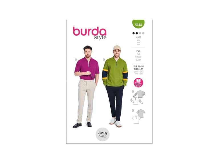 - Make a fashion statement with this Burda style pullover pattern; The two variations bring retro flair to spring: the men's polo shirt with a stand-up collar and zipper features casual color-blocking stripes that are easy to find on the pattern sheet