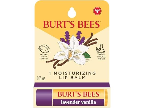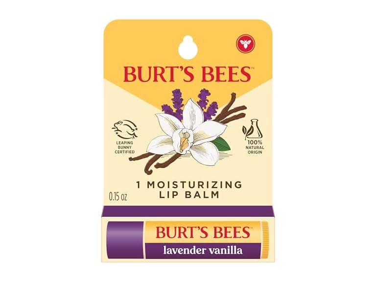 - MOISTURIZING LIP BALM: One 0.15 oz. lip balm tube of Burt’s Bees Lavender Vanilla Moisturizing Lip Balm