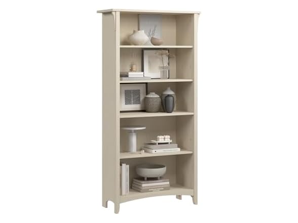 - (1) Bush Furniture Salinas 5 Shelf Bookcase in Antique White, Tall Bookshelf, Large Book Shelf for Living Room, Home Office, or Entryway