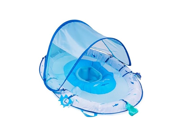 Features ULTRA BABY SPRING FLOAT: Part of Swimways' Swim Step 1: First Splash items that helps babies 9-24 months old become comfortable in the water, keeping them supported and balanced with our most premium pool float!,4 WATER-SAFE TOYS: Developmentally appropriate shark themed toys for optimal splashing and playing that can be strapped onto the float for easy access or removed from the float for better mobility,PROTECTIVE CANOPY: Adjustable and removable UPF 50+ protective canopy provides maximum sun protection,COMFORTABLE AND STABLE: Adjustable air mesh seat with ultra-soft material ensures a comfy fit for your little one, while the inner spring technology provides efficient stability,NEW HYPER-FLATE VALVE: Features extremely innovative and convenient technology that enables parents to inflate the baby float approximately 3 times faster than before Description Introduce the fascinating world of the water to your little beginner swimmer in a fun and safe way with the Swimways Sun Canopy Inflatable Ultra Baby Spring Float. It's the newest and most premium baby float that will ensure an amazing and memorable experience for your baby and the entire family. This spring float is a part of Swimways's Swim Step 1: First Splash items for water introduction that helps babies nine to twenty-four months old become comfortable in the water, keeping them supported and balanced with our top-of-the-line design! This set comes with four developmentally appropriate mermaid themed water-safe toys for optimal splashing and playing that can be strapped onto the float for easy access or removed from the float for young ones to have better mobility with them. The float has an adjustable air mesh seat built with ultra-soft material to ensure a comfortable fit for your little one as well as an adjustable and removable UPF 50+ protective canopy for maximum sun protection and inner spring technology for efficient stability. The new and exclusive Hyper-Flate Valve features extremely innovative and convenient technology that enables parents to inflate the float approximately three times faster than before. Contents Inlcudes: 1 Swimways Ultra Baby Spring Float