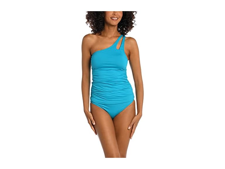 - FLATTERING DETAILS: The tankini top is the perfect balance of edge and elegance, framing your neckline with an asymmetrical slant, punctuated by a peekaboo teardrop. The geometric angle of the adjustable straps flows to the back for more graphic impact.
