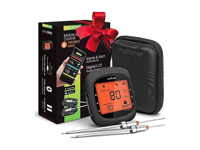 - (1) NutriChef Smart Bluetooth BBQ Thermometer with Travel Zip Case, Upgraded Stainless w/ 2 Temperature Probes, LCD Display, Done Alarm Android iPhone, Gas Charcoal BBQ Smoker Temp Monitoring