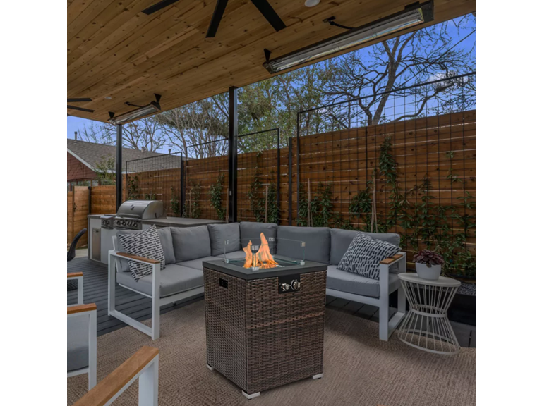 - Space-saving dual-purpose design: This 22-inch square fire pit table maximizes practicality in a compact space. It comes with a tempered glass wind shield and a durable waterproof rain cover, making it perfect for intimate gatherings, quiet evenings or casual outdoor dining.