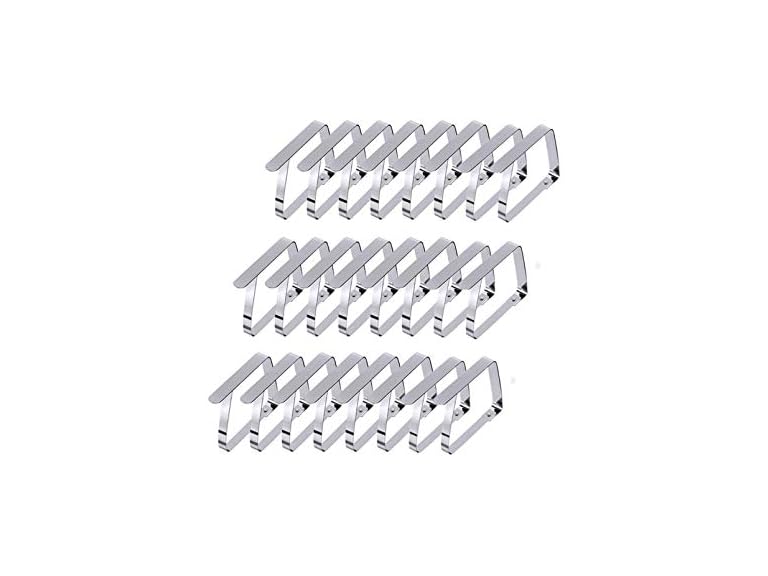 - Sturdy Material – 24Pack Tablecloth holders made of SS201, the strongest type of 18/8 Stainless Steel. Sturdy and rust resistant. It nice finished with smooth edge which will not scratch the tablecloth and keep tablecloth lays flat outdoor or indoor