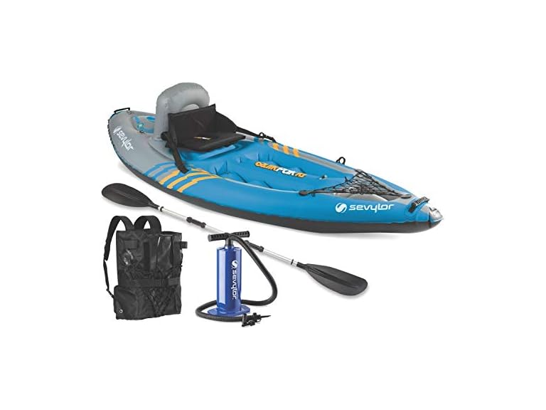 - (1) Sevylor QuickPak K1 1-Person Inflatable Kayak, Kayak Folds into Backpack with 5-Minute Setup, 21-Gauge PVC Construction; Hand Pump & Paddle Included