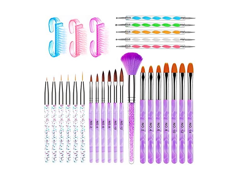 - (1) AROIC 28 Pcs Acrylic Nail Brush Set Including 7 Pcs UV Gel Nail Art Brushes, 6 Pcs 3D Nail Extension Brush, 5Pcs Double Ended Dotting Nail Pen For Nail Art DIY With White Box, colorful