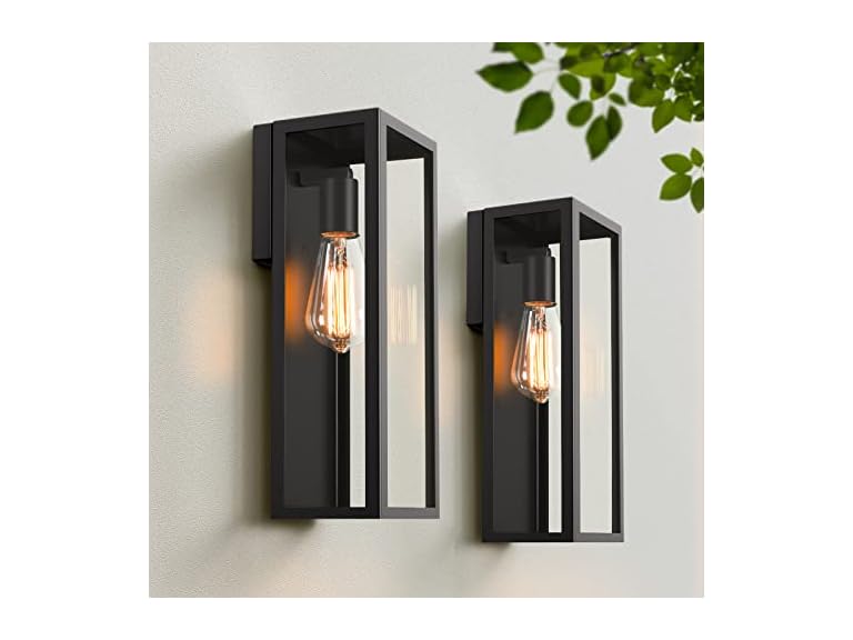 - Modern Design & Stylish Appearance: Designed with a classic matte black finished frame with rectangle shape, adding an elegant and minimalist style to these black outdoor wall lights. Equipped with clear glass shades increase a sense of modern and stylish appearance to the 2-pack wall mount lights. Three pieces of high-quality tempered glass not only protect the bulb but transmit light to create a gentle and cozy atmosphere