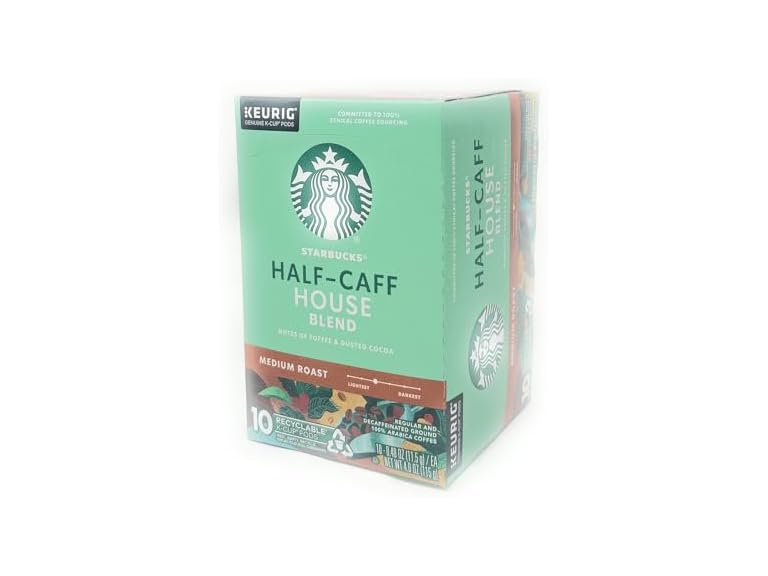 - PREMIUM COFFEE IN KEURIG K-CUP PODS—Starbucks delivers exceptional coffee cup after cup with Starbucks Half-Caff House Blend medium-roast coffee K-Cup pods with with just enough caffeine—10 total coffee pods for Keurig coffee makers