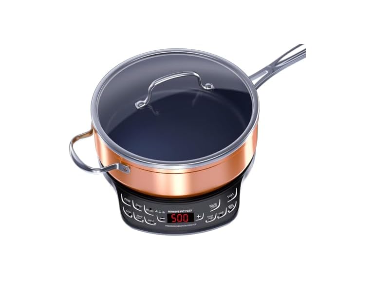 - (1) Nuwave Flex Precision Induction Cooktop, 10.25” Shatter-Proof Ceramic Glass, 6.5” Heating Coil, 45 Temps 100°F to 500°F, 4Qt Induction-Ready Healthy Ceramic Non-Stick Everyday Pan with Lid Included