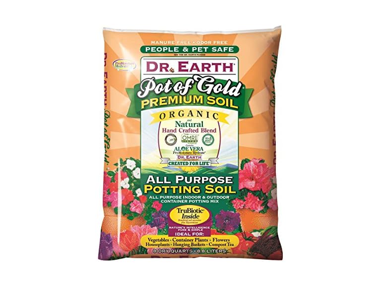 Could your container plants use a little pick-me-up? Then you're going to want to hear all you can about Dr. Earth's Pot of Gold All-Purpose Premium Potting Soil. Formulated for both indoor and outdoor potting and container use, this soil is a perfect match for your herbs, vegetables, indoor gardens, all container plants and flowers. The one feature that we know will seize your attention is the soil's versatility, as it's able to tackle a wide array of garden projects, which means you can finally get things done. So how can you use it? In more ways than you might expect: You can use it as a soil amendment for the in-ground planting of trees, shrubs, bare roots, flowers and vegetables. The soil is also great for mulching, seed cover, indoor garden production, transplanting, compost use, soil boosts and even clay soil applications. As you can see, this is one ridiculously versatile soil! With benefits like these at your disposal, it should come as no surprise that this soil is only loaded with quality ingredients like alfalfa meal, wild-caught fish bone meal, cold water kelp and a heavy dose of rich organic nutrients. These composted organic nutrients include aged fir bark, fir bark, perlite, peat moss, composted green waste, sawdust, alfalfa meal, fishbone meal, bone meal, feather meal, kelp meal, kelp flour, dolomite lime, gypsum and wetting agent to ensure the proper establishment of your plants. And with all these organic nutrients is the welcome addition of TruBiotic soil microbes with both ecto and endo mycorrhizae. Dr. Earth's Pot of Gold All-Purpose Premium Potting Soil comes in an eight-quart bag, includes Pro-Moisture Hydrate, is OMRI listed, MycoApply certified and perfectly safe for both pets and people. Give your container plants exactly what they need and nothing they don't, and pick up a bag of soil today.