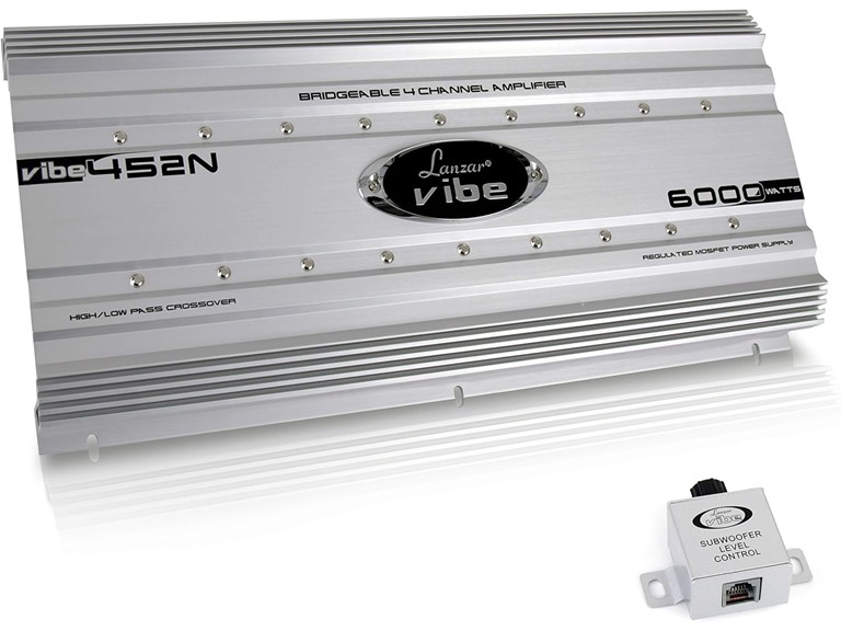 - (1) Lanzar Car Audio, Stereo Amplifier, 6,000 Watt, 4-Channel, Mosfet Amplifier, RCA Input, Subwoofer Bass Control, Power Amp, LED Indicator