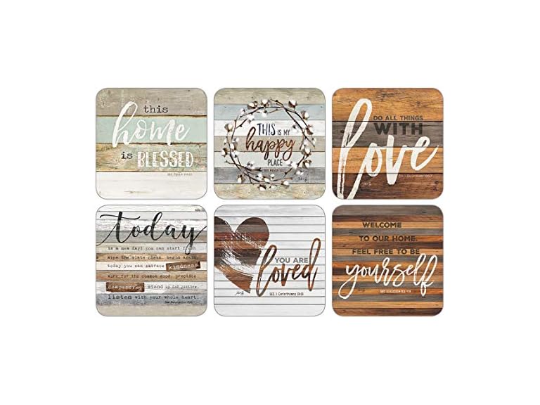- SET of 6: Durable, square, cork-backed coasters each one has a different message from scripture based in love