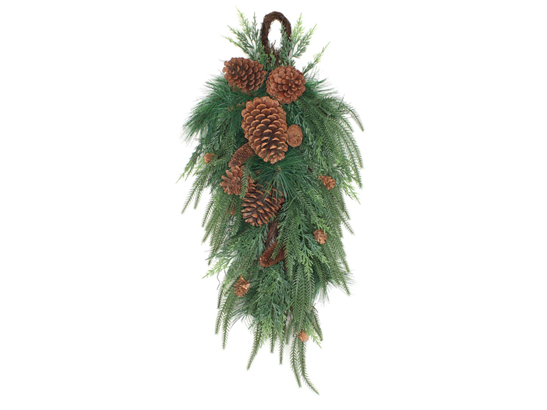 - This fantastically festive teardrop shaped swag features a cascade of evergreen and bristle branches decorated with pinecones with a top loop