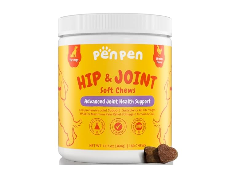 - (1) PENPENPET Hip and Joint Supplement for Dogs with Glucosamine for Dogs Chondroitin, MSM, and Turmeric to Support Joint Health, Promote Mobility (Chicken Chews, 180ct)