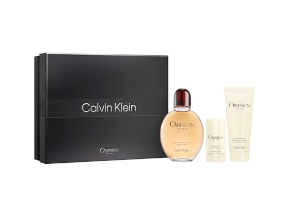 - Calvin Klein Obsession Eau de Toilette for Men. Driven by passion. This Calvin Klein perfume gift set includes: - Obsession Eau de Toilette for Men 125ml 4.2oz - Obsession After Shave Balm 100ml 3.3oz - Obsession Deodorant Stick 75ml 2.5oz