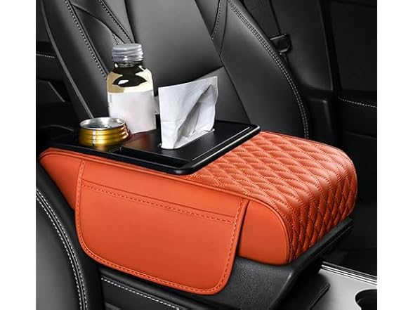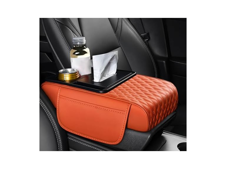 - 【Excellent Material】The car armrest pad is made of excellent leather, which is water resistant, breathable, wear-resistant. Easy to resist daily stains and scratches, easy to wipe clean. Organize your essentials with built-in dual cup holders, a tissue box slot, phone holder, and two side pockets. Keep everything from beverages to phones easily accessible while driving