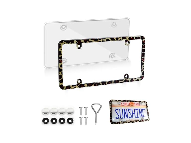 - 1pcs License Plate Protector Unbreakable License Plate Frames and Covers Set Front and Rear Clear License Plate Cover Leopard Print License Plate Frames Fits Standard Us Plates with Screws Caps