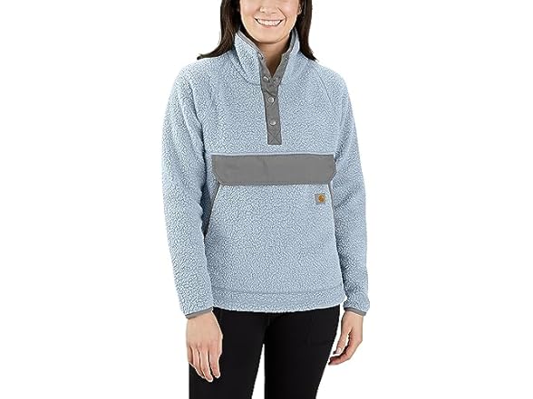 This women's Carhartt pullover keeps you cozy when work takes you outside. Fleece fabric is soft and warm. Storm flap on the front pocket with a hook-and-loop closure keeps essentials safely stashed. A relaxed fit allows for easy movement.