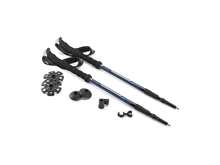 - Includes tungsten carbide tips and durable rubber tips for less giving surfaces, snow baskets and optional disk for use on softer ground coverings, also includes pole clips for easy storage