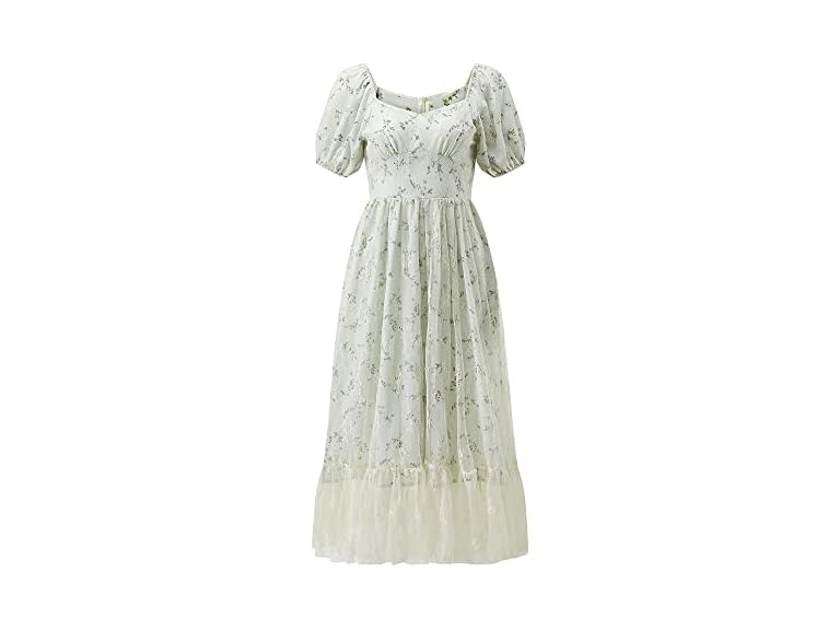 - Features: vintage floral lace cottagecore dress, short puff sleeves, elastic cuff, elegant square neck, high waistline, back zipper closure, ruffle lace hem, midi length
