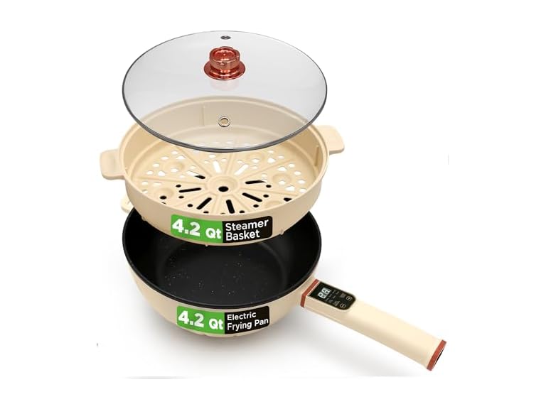 - LARGE 4 QT CAPACITY WITH LID – Maximize cooking for family meals with a spacious 4L electric frying pan and a matching 4L steamer. Features a glass lid with anti-spill steam vents for easy monitoring and mess-free cooking sessions.