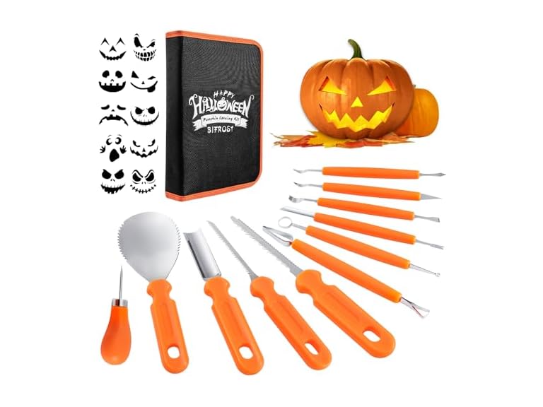 - All-in-one Pumpkin Carving Set - The complete kit includes 6 x heavy duty stainless steel sculpting tools, 1 x pumpkin scooper,2 x tooth saw,1 x etching tool,1 x pumpkin drill,1 x premium nylon organizer case and 10 pieces of different Pattern Stencils. these solid tools allow you to carve out a creative and unique Jack-O'-Lantern with ease.