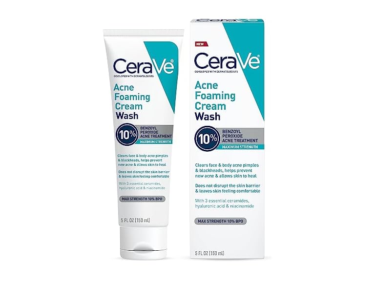 - (1) CeraVe Acne Foaming Cream Wash, Gentle Face and Body Cleanser with Benzoyl Peroxide 10%, Hyaluronic Acid, and Niacinamide, 10% Benzoyl Peroxide Treatment Clears Pimples and Blackheads 5 Oz