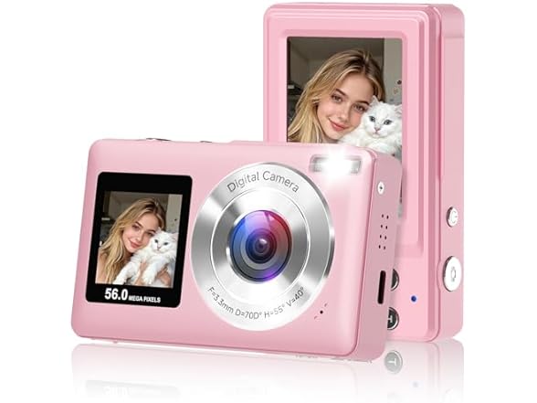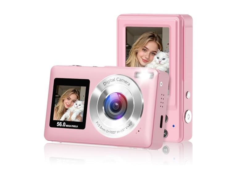 - Dual-Screen Camera with Smile Capture: The compact digital camera equipped a large 2.4-inch rear display and a 1.4-inch front screen, lets you see yourself clearly while taking selfies or recording Vlogs. It features image recognition and sensor technology to achieve smile capture and face tracking, accurately locking in moments of laughter. Built-in LED flash ensures sharp, well-lit images in low light. Ideals for teens and beginners who love vlogging.